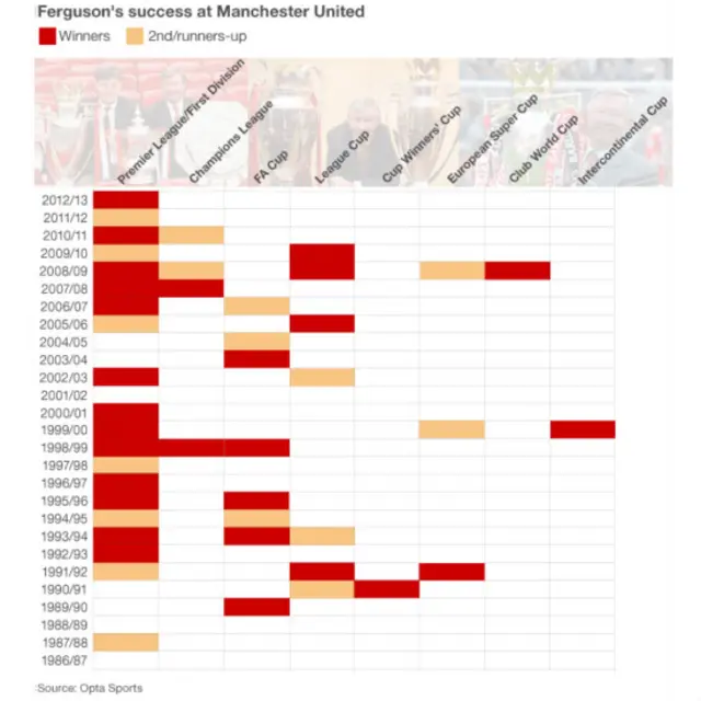Thế nhưng đội bóng của Anh đã thắng ít hơn trong các giải bóng đá thế giới. Dưới đây là tổng kết thành tích của Sir Alex tại Man U. Đỏ: giành danh hiệu. Vàng: Về nhì.