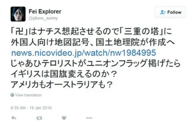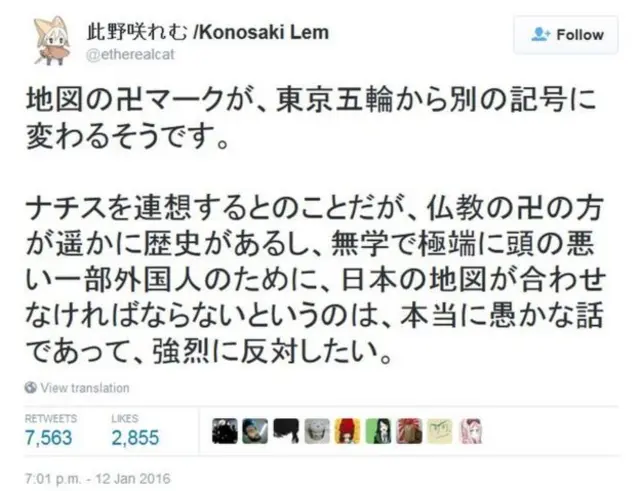Một người dùng Twitter khác, Konosaki Lem, thì viết: "Người ta nói một số người sẽ nhầm các dấu Manji với biểu tượng 'chữ thập ngoặc' của Đức quốc xã, nhưng Phật giáo có lịch sử lâu dài hơn nhiều so với biểu tượng kia. Vì vậy, tôi mạnh mẽ phản đối việc thay đổi bản đồ của chúng ta dành cho một số người nước ngoài những người thiếu hiểu biết và vô cùng ngu ngốc. Thật là ý tưởng ngu ngốc."